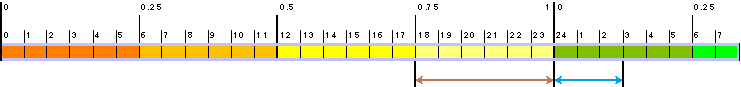Beispiel 18:00 bis 03:00 >> (1 - 0.75) + 0.125 = 0.25 + 0.125 = 0.375 = 9 Std.